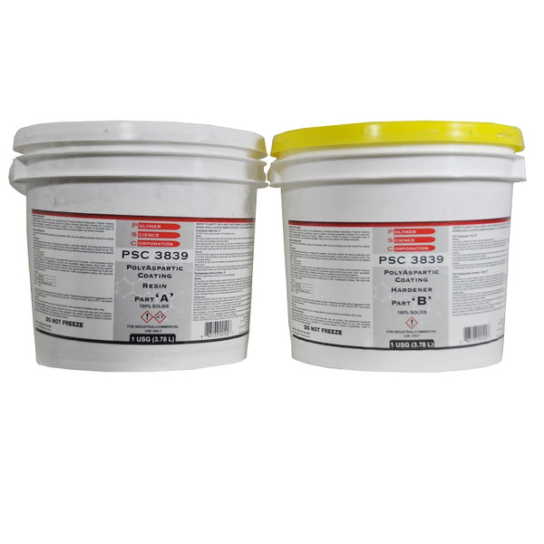 PSC 3839 PolyAspartic Polyurea Coating PSC 3839 PolyAspartic is a two component, 100% solids, very fast setting polyaspartic coating, providing a fast turn-around time for the application. It comes in clear and can be used as base or top coat. This zero VOC system has been formulated to have a balanced pot-life/ cure schedule.