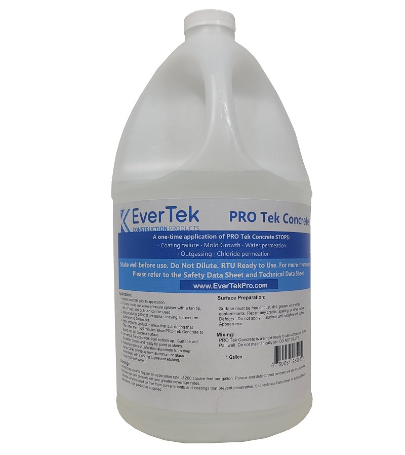 3.       Surface should be clean, sound, free from grease, silicone, or any material that will prevent penetration of PRO Tek Concrete. For general cleaning prior to application, use EverTek’s Greasy Clean.
